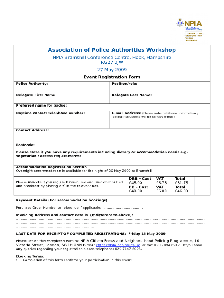 The NPIA Bramshill Conference Centre, Hook, Hampshire - btpa police is a writable document that has to be completed and signed for specific needs. In that case, it is furnished to the actual addressee to provide certain info and data. The completion and signing is available in hard copy or via a suitable tool like PDFfiller. These applications help to complete any PDF or Word file without printing out. It also lets you edit it for your needs and put a legal e-signature. Once finished, the user sends the NPIA Bramshill Conference Centre, Hook, Hampshire - btpa police to the recipient or several ones by mail and also fax. PDFfiller provides a feature and options that make your Word template printable. It has a number of settings for printing out appearance. It does no matter how you'll deliver a document - physically or electronically - it will always look professional and organized. In order not to create a new document from the beginning all the time, turn the original form as a template. Later, you will have a rewritable sample.