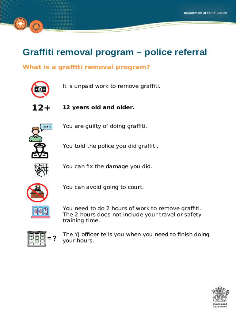 Frequently asked questions about the form Graffiti removal program (police referral) easy English. Graffiti removal programs from police referral