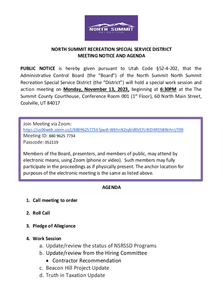 NORTH SUMMIT RECREATION SPECIAL SERVICE DISTRICT MEETING NOTICE AND AGENDA PUBLIC NOTICE is hereby given pursuant to Utah Code 524202, that the Administrative Control Board (the Board) of the North