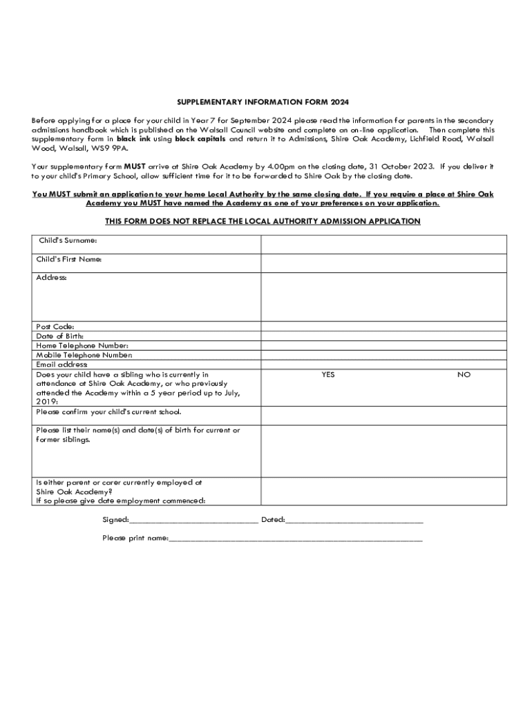 The information required on Shire Oak Academy supplementary typically includes personal details of the student, academic records, and any other relevant documentation as mandated by the academy.