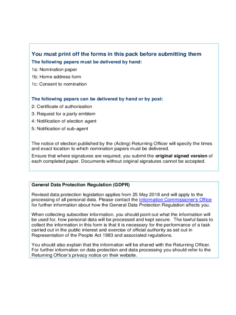 You must print off the forms in this pack before submitting them The following papers must be delivered by hand: 1a: Nomination paper 1b: Home address form 1c: Consent to nomination The following