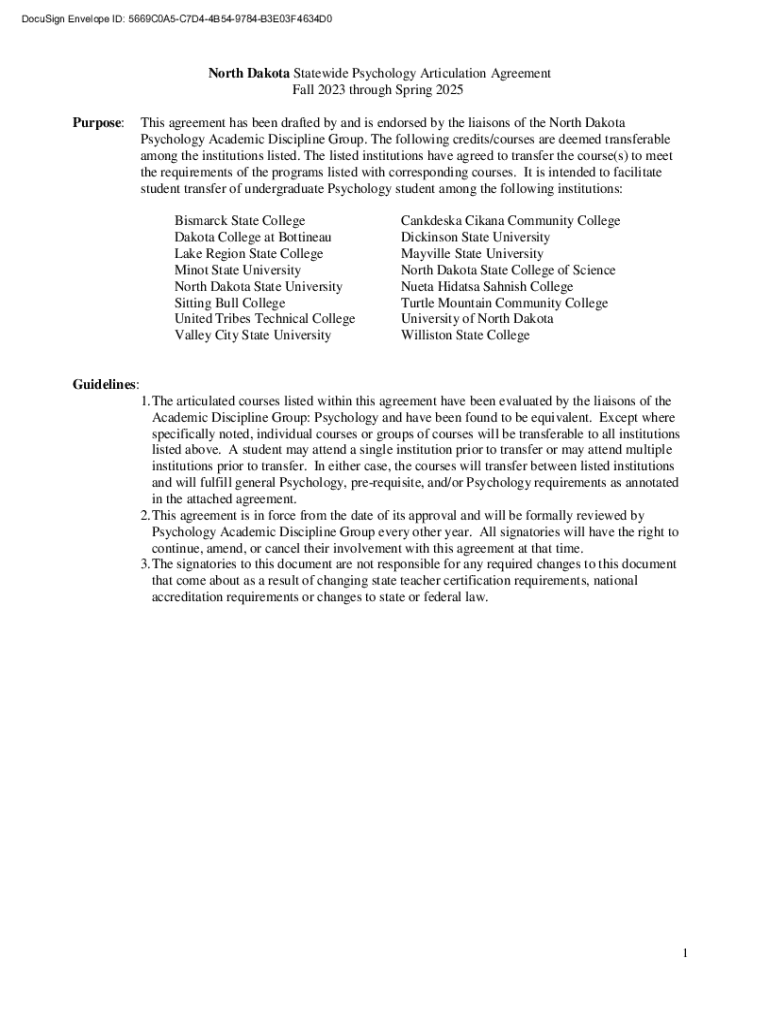 DocuSign Envelope ID: 5669C0A5C7D44B549784B3E03F4634D0North Dakota Statewide Psychology Articulation Agreement Fall 2023 through Spring 2025 Purpose:This agreement has been drafted by and is endorsed