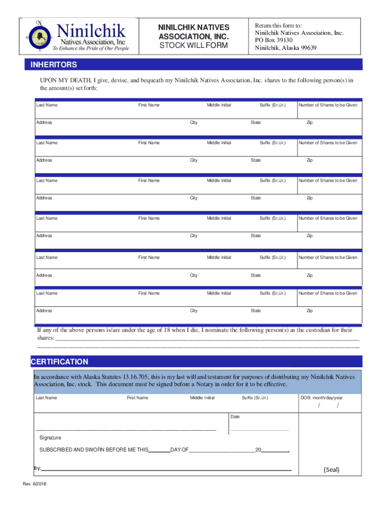 Return this form to: Ninilchik Natives Association, Inc. PO Box 39130 Ninilchik, Alaska 99639NINILCHIK NATIVES ASSOCIATION, INC. STOCK WILL FORM INHERITORSUPON MY DEATH, I give, devise, and bequeath