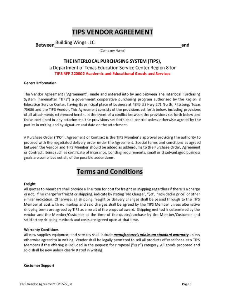 TIPS VENDOR AGREEMENT Building Wings LLC Between___and (Company Name)THE INTERLOCK PURCHASING SYSTEM (TIPS), a Department of Texas Education Service Center Region 8 for TIPS RFP 220802 Academic and