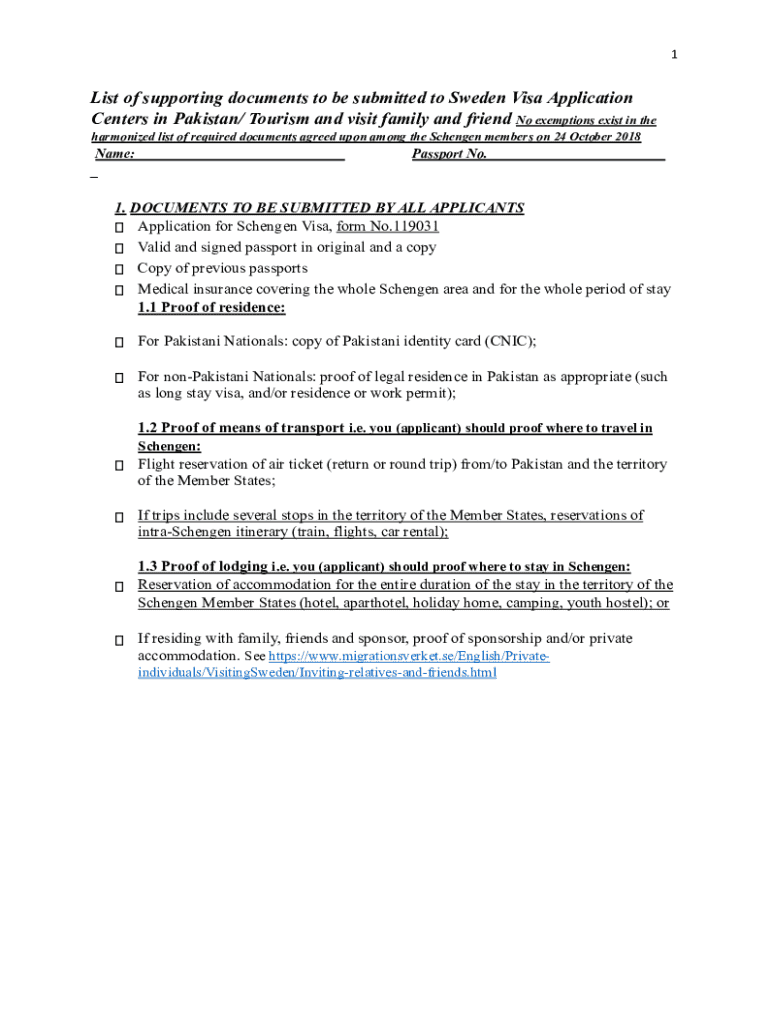 1List of supporting documents to be submitted to Sweden Visa Application Centers in Pakistan/ Tourism and visit family and friend No exemptions exist in the harmonized list of required documents agreed