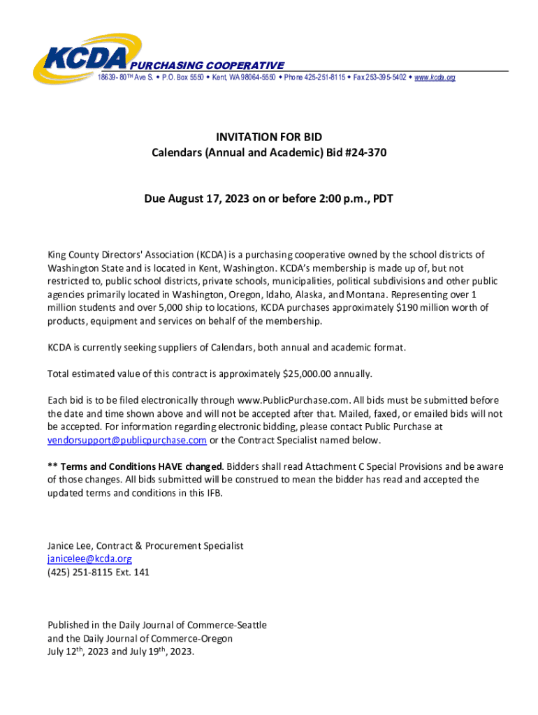 PURCHASING COOPERATIVE18639 80TH Ave S. P.O. Box 5550 Kent, WA 980645550 Phone 4252518115 Fax 2533955402 www.kcda.orgINVITATION FOR BID Calendars (Annual and Academic) Bid #24370 Due August 17, 2023