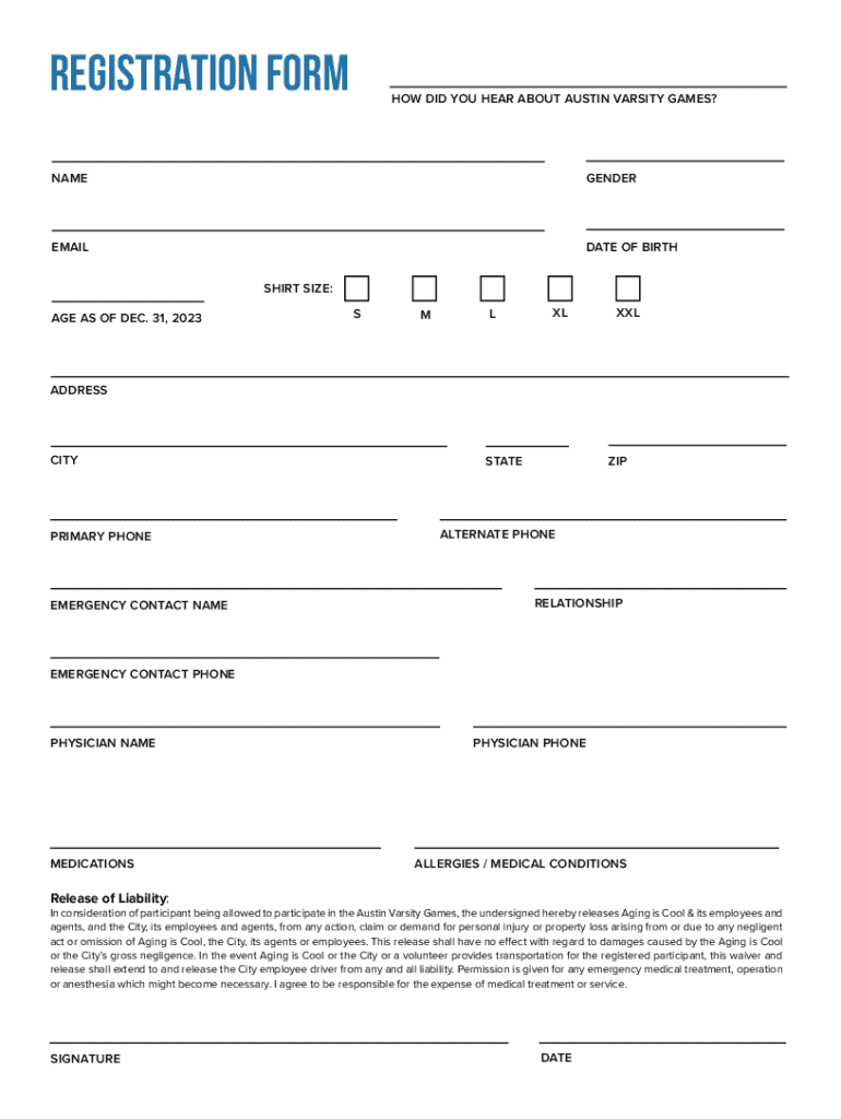 OPEN TO PARTICIPANTS AGES 50+2024 registration packet EMAIL: VarsityGames@austintexas.govwelcome WELCOME TO THE 2024 AUSTIN VARSITY GAMES The Austin Parks and Recreation Department would like to welcome