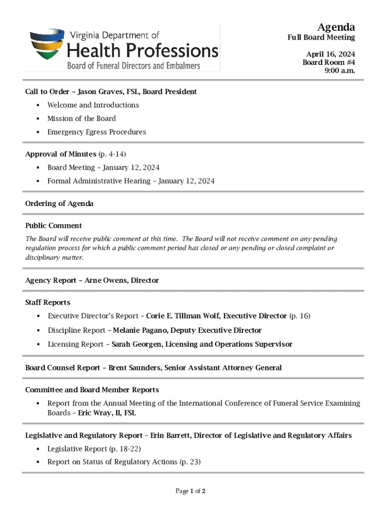 Welcome and IntroductionsMission of the BoardEmergency Egress ProceduresApproval of