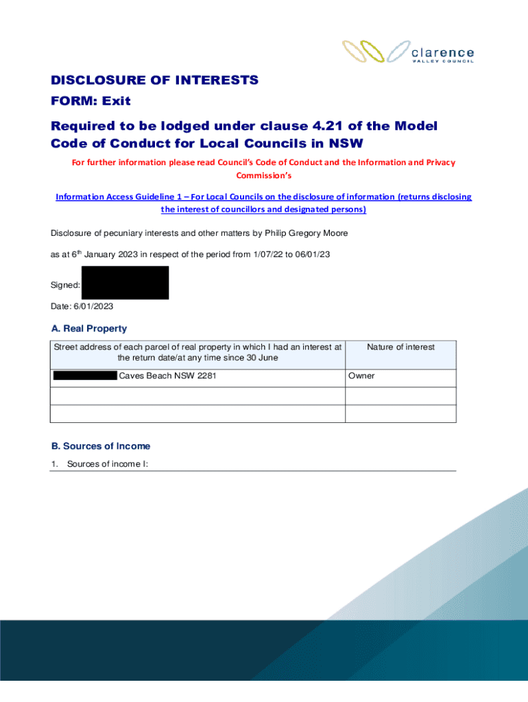 DISCLOSURE OF INTERESTS FORM: Exit Required to be lodged under clause 4.21 of the Model Code of Conduct for Local Councils in NSW For further information please read Councils Code of Conduct and the