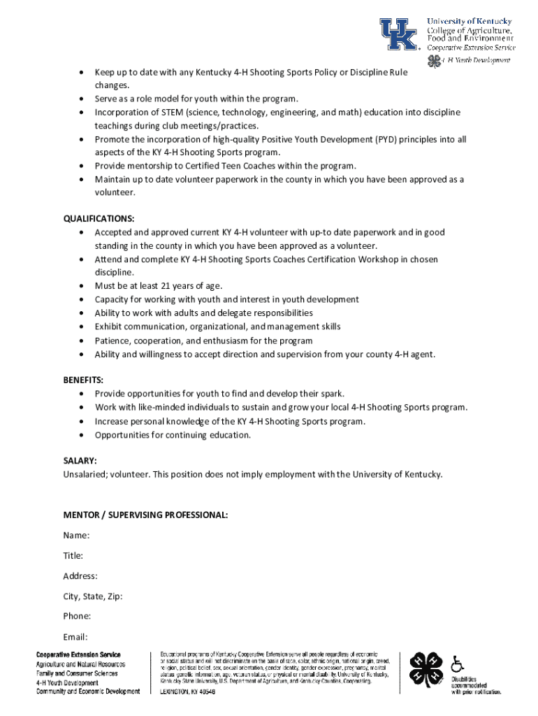 KY 4H Shooting Sports Certified Level I Instructor VOLUNTEER POSITION DESCRIPTION: Kentucky 4H Youth Development Program Kentucky Cooperative Extension Service The University of Kentucky College of