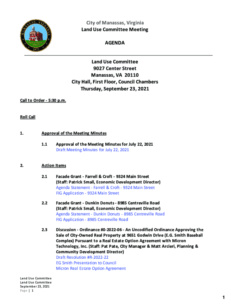 City of Manassas, Virginia Land Use Committee Meeting AGENDA Land Use Committee 9027 Center Street Manassas, VA 20110 City Hall, First Floor, Council Chambers Thursday, September 23, 2021, Call to