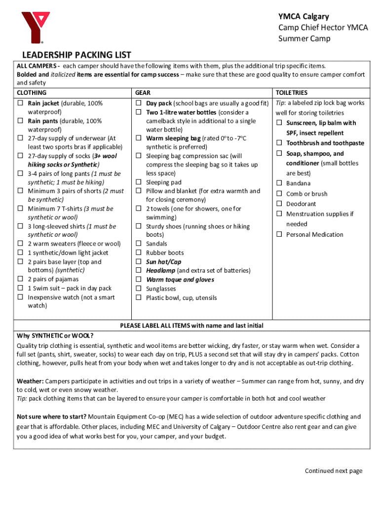 ALL CAMPERS each camper should have the following items with them, plus the additional trip specific items.