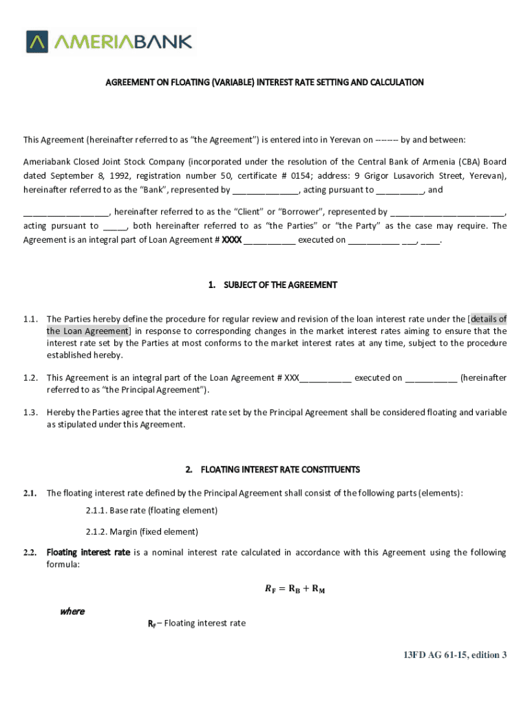 AGREEMENT ON FLOATING (VARIABLE) INTEREST RATE SETTING AND Calculations Agreement (hereinafter referred to as the Agreement) is entered into in Yerevan on by and between: