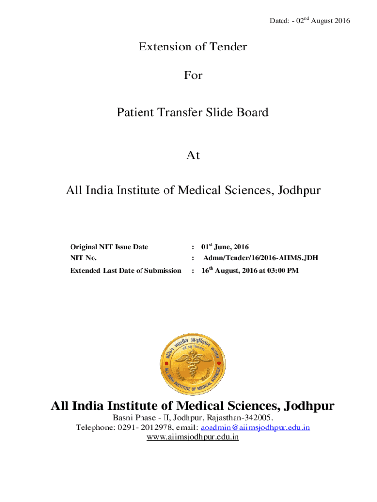 All India Institute of Medical Sciences, JodhpurOriginal NIT Issue Date: 01st June, 2016NIT No.:Extended Last Date of