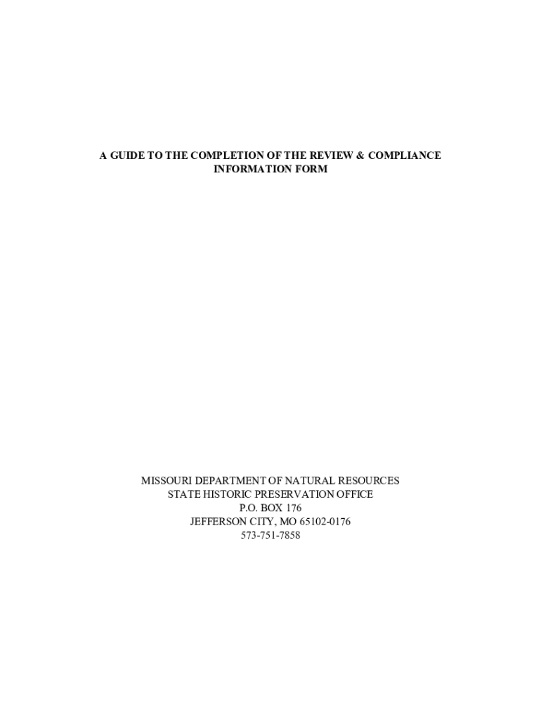 A GUIDE TO THE COMPLETION OF THE REVIEW & COMPLIANCE INFORMATION FORMMISSOURI DEPARTMENT OF NATURAL RESOURCES STATE HISTORIC PRESERVATION OFFICE P.O. BOX 176 JEFFERSON CITY, MO 651020176 5737517858The