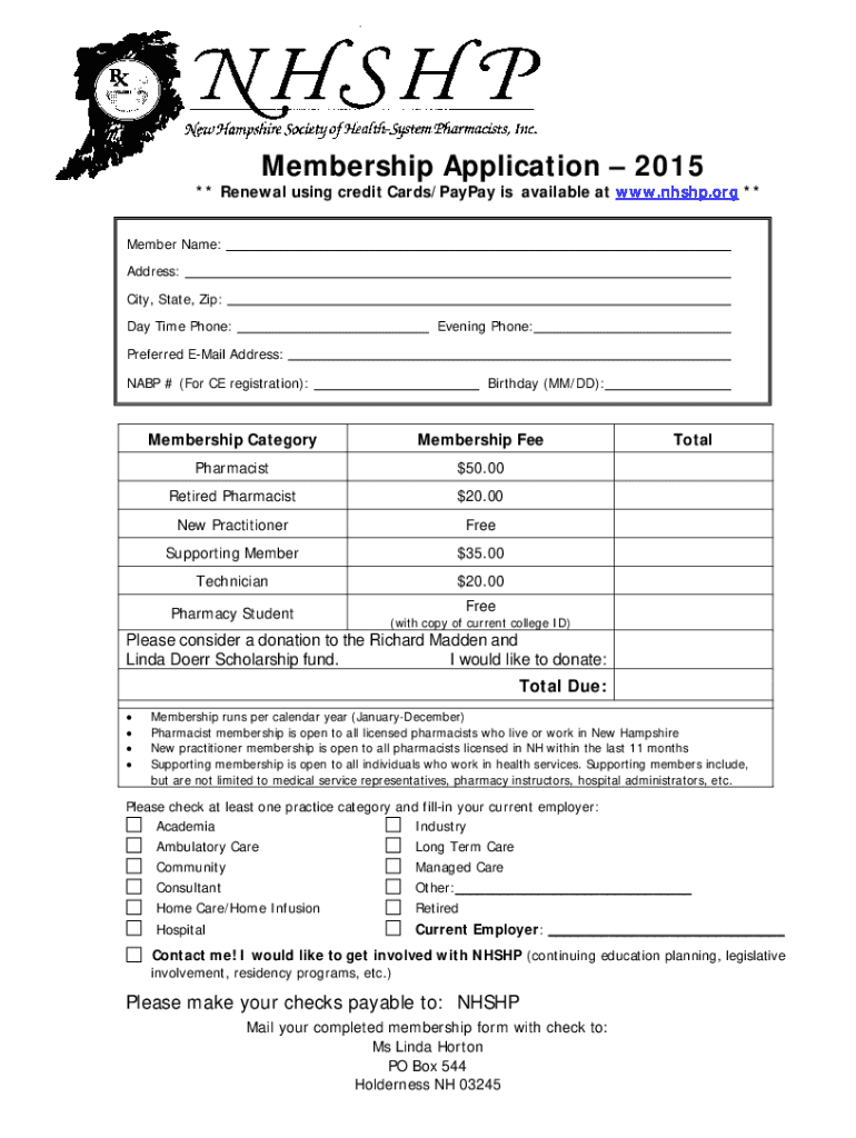 Membership Application 2015** Renewal using credit Cards/PayPal is available at www.nhshp.org **