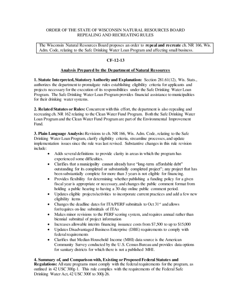 ORDER OF THE STATE OF WISCONSIN NATURAL RESOURCES BOARD REPEALING AND RECREATING RULES The Wisconsin Natural Resources Board proposes an order to repeal and recreate ch. NR 166, Wis. Adm. Code, relating