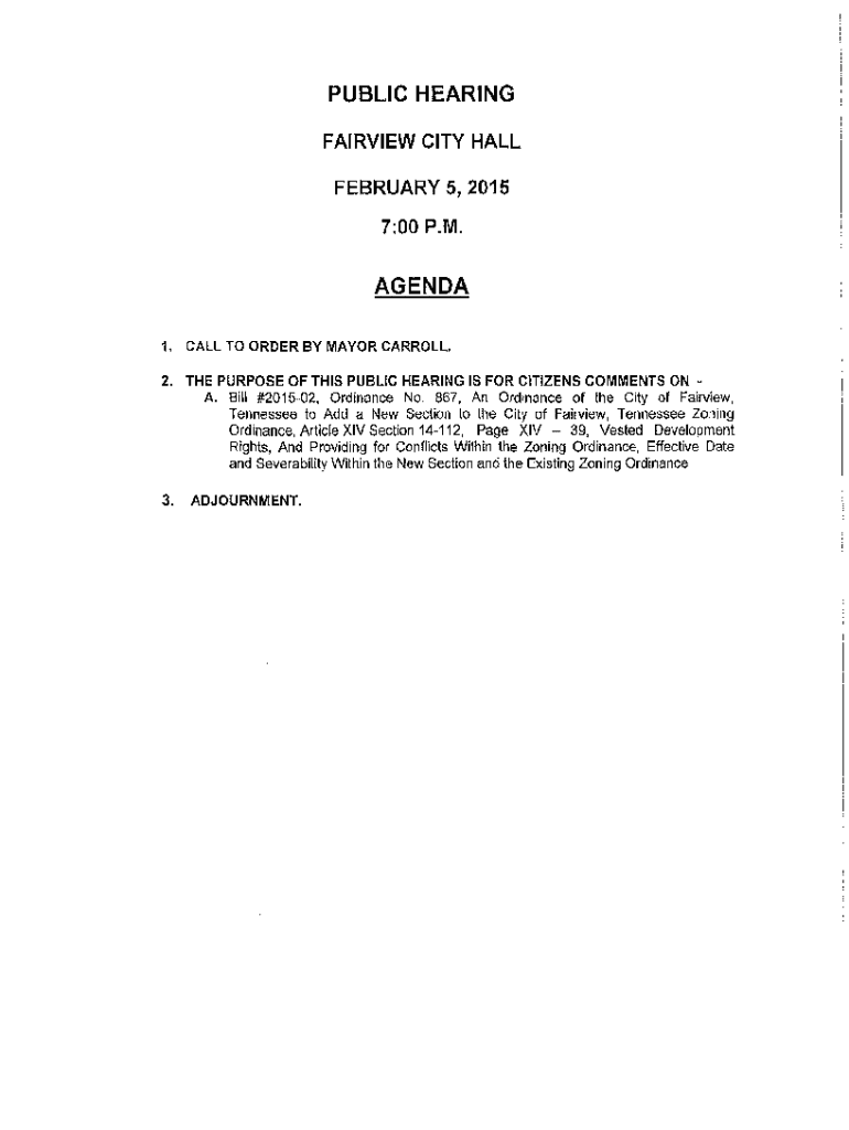 PUBLIC HEARING FAIRVIEW CITY HALL FEBRUARY 5, 2015 7:00P.M.AGENDA 1.CALL TO ORDER BY MAYOR CARROLL.2. THE PURPOSE OF THIS PUBLIC HEARING IS FOR CITIZENS COMMENTS ON A. Bill #201502, Ordinance No.
