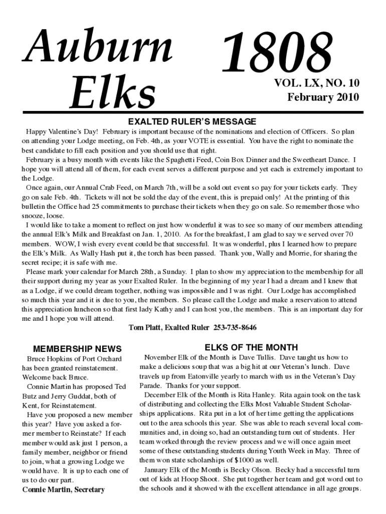 Auburn Elks1808Vol. LX, No. 10 February 2010EXALTED RULERS MESSAGEHappy Valentine's Day! February is important because of the nominations and election of Officers. So plan on attending your Lodge