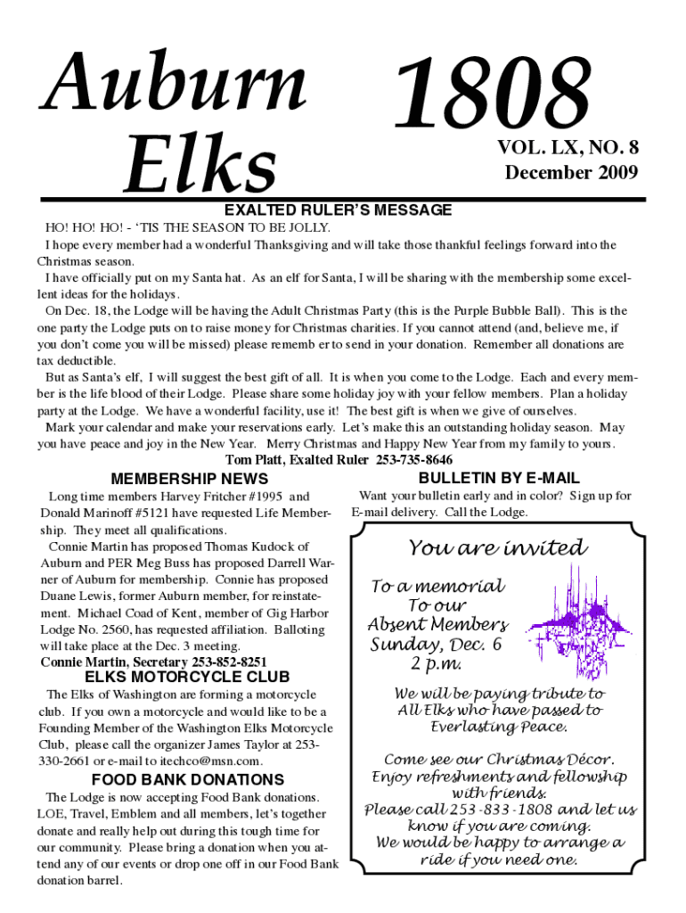 Auburn Elks1808Vol. LX, No. 8 December 2009EXALTED RULERS MESSAGE HO! HO! HO! TIS THE SEASON TO BE JOLLY. I hope every member had a wonderful Thanksgiving and will take those thankful feelings forward