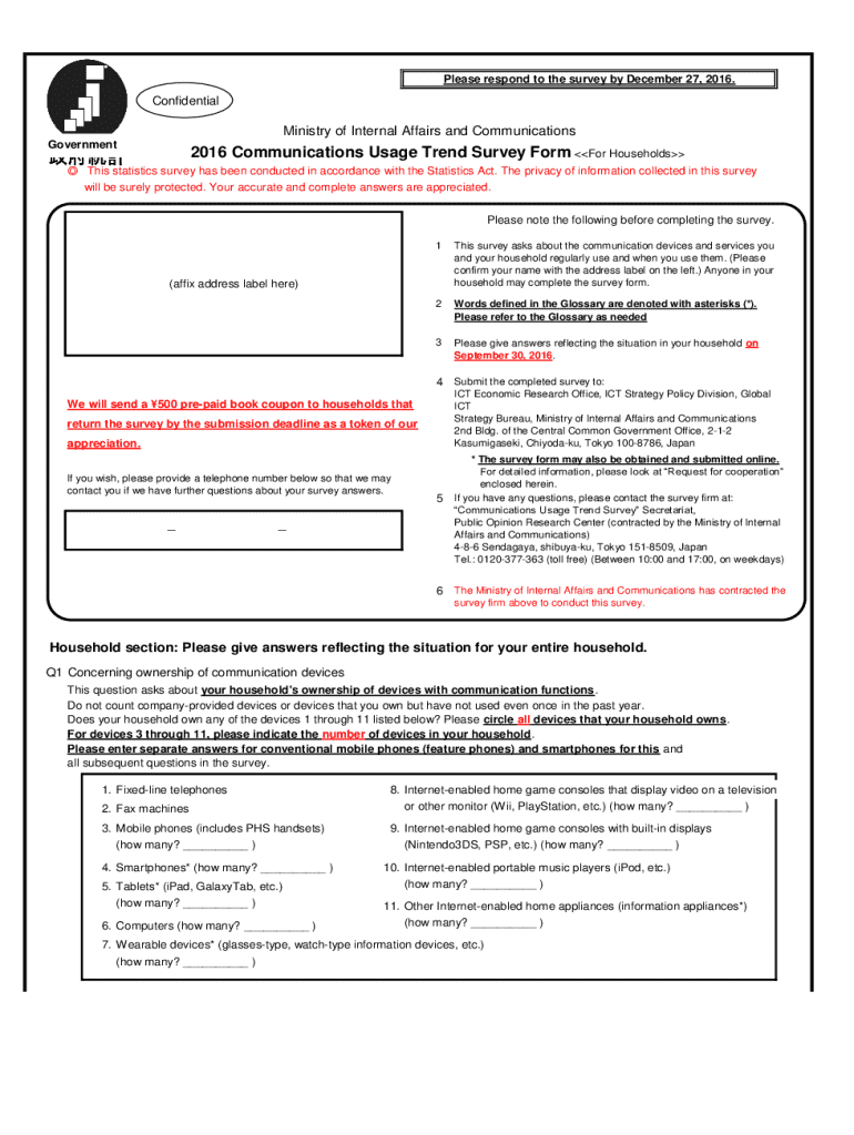 Please respond to the survey by December 27, 2016. ConfidentialMinistry of Internal Affairs and Communications Government2016 Communications Usage Trend Survey Form For Households This statistics