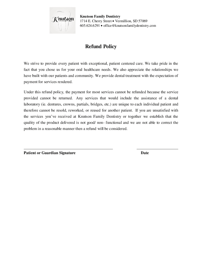 Knudsen Family Dentistry 1714 E. Cherry Street Vermilion, SD 57069 605.624.6291 office@knutsonfamilydentistry.comRefund Policy We strive to provide every patient with exceptional, patient centered