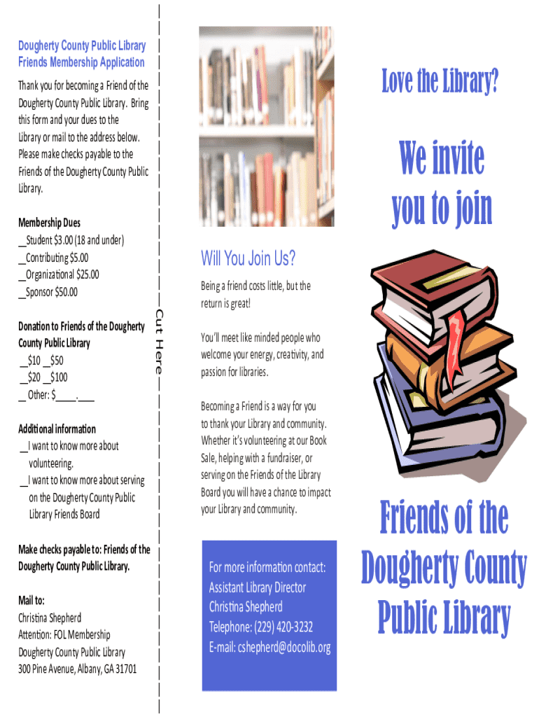 Thank you for becoming a Friend of the Dougherty County Public Library. Bring this form and your dues to the Library or mail to the address below. Please make checks payable to the Friends of the