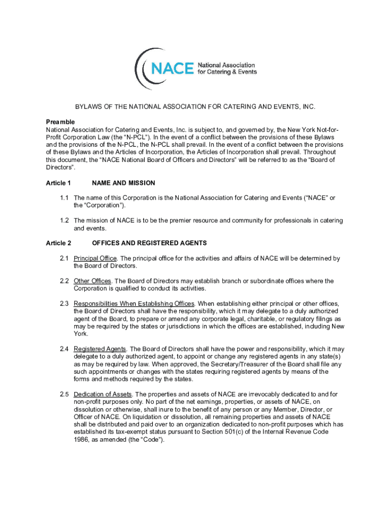 National Association for Catering and Events, Inc. is subject to, and governed by, the New York NotforProfit Corporation Law