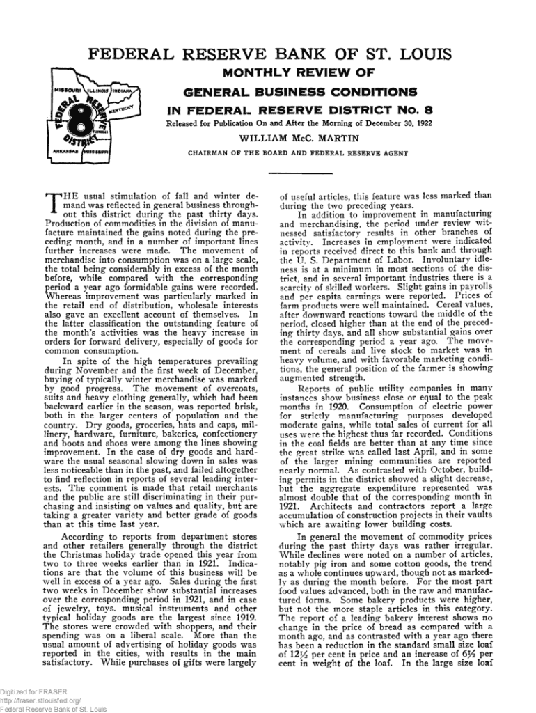 FEDERAL RESERVE BANK OF ST. LOUIS MONTHLY REVIEW OF GENERAL B U SIN ESS CONDITIONS IN FEDERAL RESERVE DISTRICT NO. 8 Released for Publication On and After the Morning of December 30, 1922W I L L I