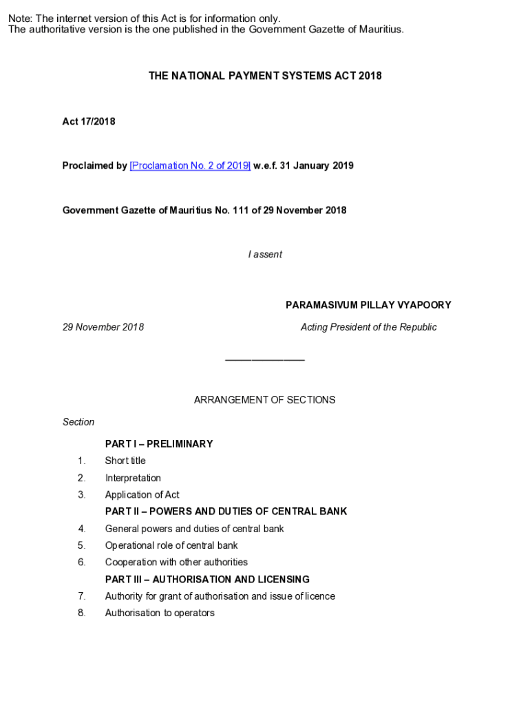 Note: The internet version of this Act is for information only. The authoritative version is the one published in the Government Gazette of Mauritius.THE NATIONAL PAYMENT SYSTEMS ACT 2018Act 17/2018Proclaimed