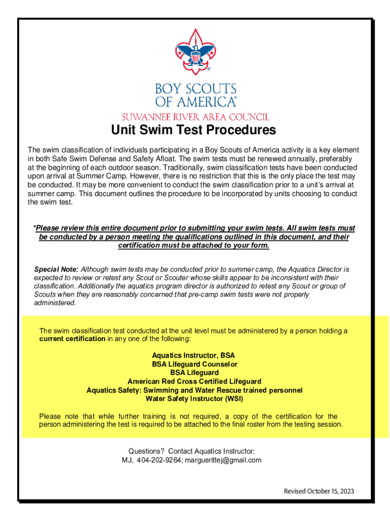 Unit Swim Test Procedures The swim classification of individuals participating in a Boy Scouts of America activity is a key element in both Safe Swim Defense and Safety Afloat. The swim tests must
