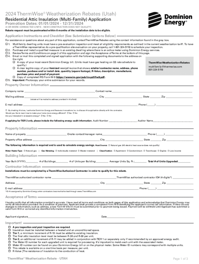2024 ThermWise Weatherization Rebates (Utah) Residential Attic Insulation (MultiFamily) Application Promotion Dates: 01/01/2024 12/31/2024(4 OR MORE CONNECTED UNITS NEW CONSTRUCTION DOES NOT QUALIFY)Rebate