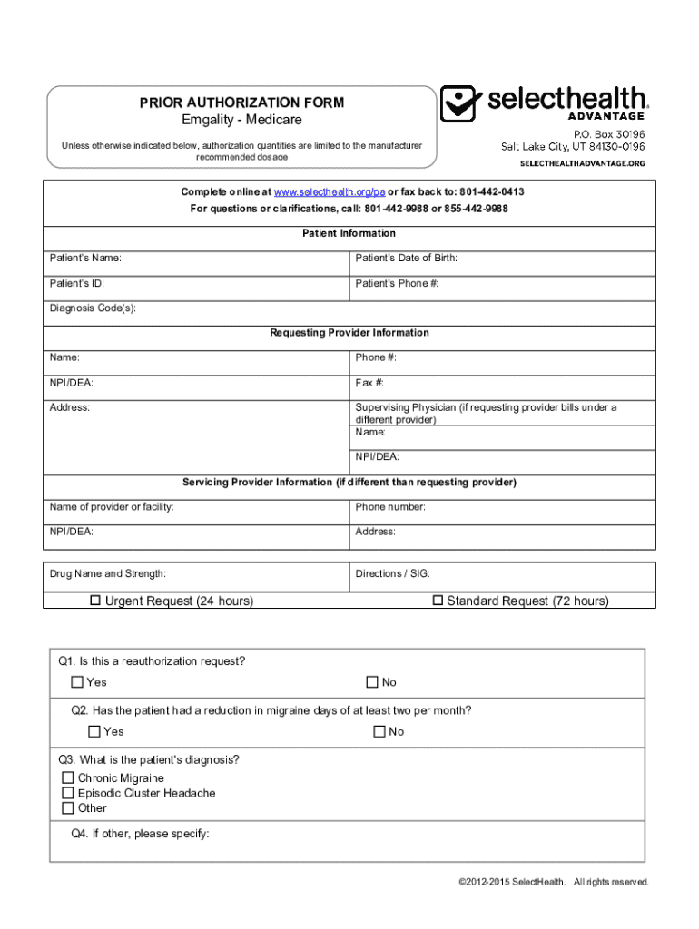 PRIOR AUTHORIZATION FORM Emgality Medicare Unless otherwise indicated below, authorization quantities are limited to the manufacturer recommended dosageComplete online at www.selecthealth.org/pa or