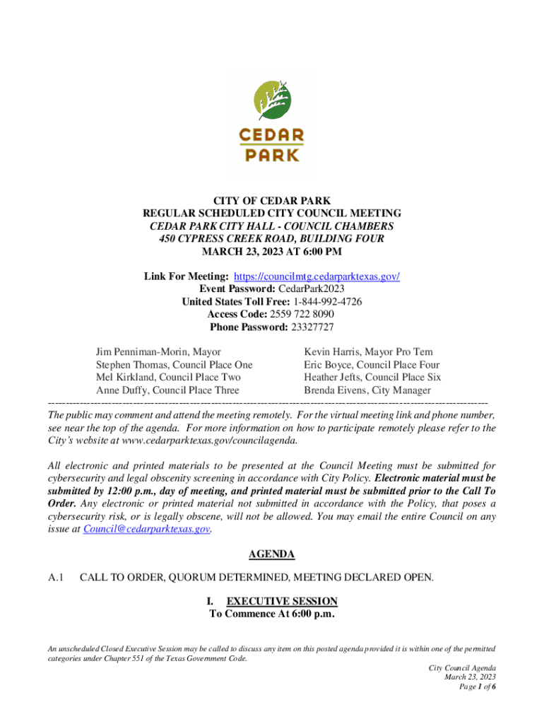 Link For Meeting: https://councilmtg.cedarparktexas.gov/