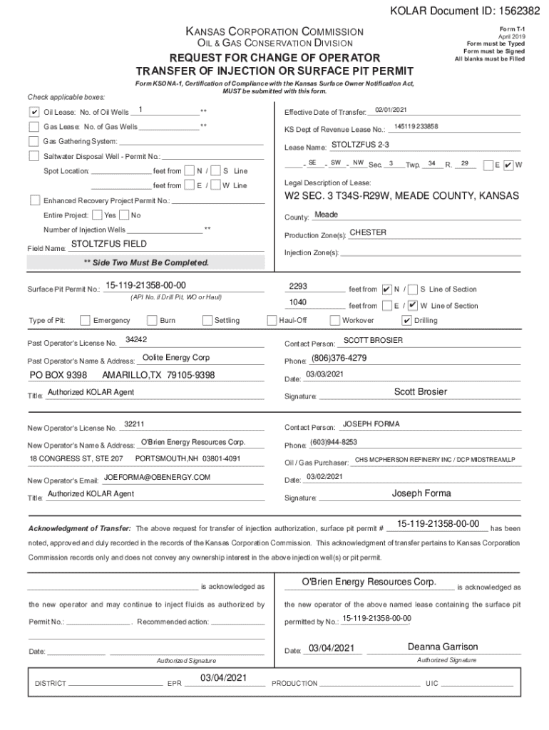 KOLAR Document ID: 1562382K ANSAS CORPORATION COMMISSIONForm T1 April 2019 Form must be Typed Form must be Signed All blanks must be FilledOIL & GAS CONSERVATION DIVISION REQUEST FOR CHANGE OF OPERATOR