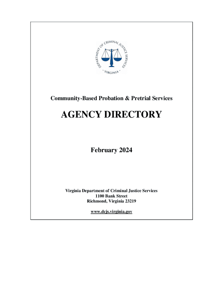 CommunityBased Probation & Pretrial ServicesAGENCY DIRECTORYFebruary 2024Virginia Department of Criminal Justice Services 1100 Bank Street Richmond, Virginia 23219 www.dcjs.virginia.govCCCA/PSA AGENCY