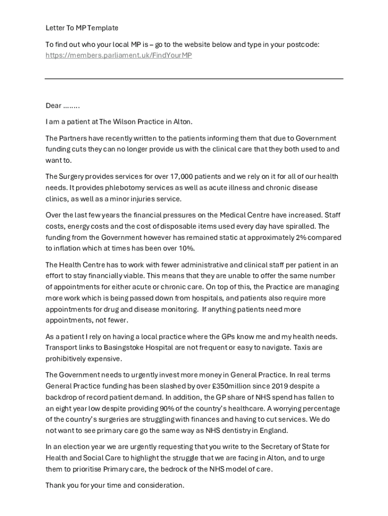 Letter To MP Template To find out who your local MP is go to the website below and type in your postcode: https://members.parliament.uk/FindYourMPDear ..... I am a patient at The Wilson Practice in