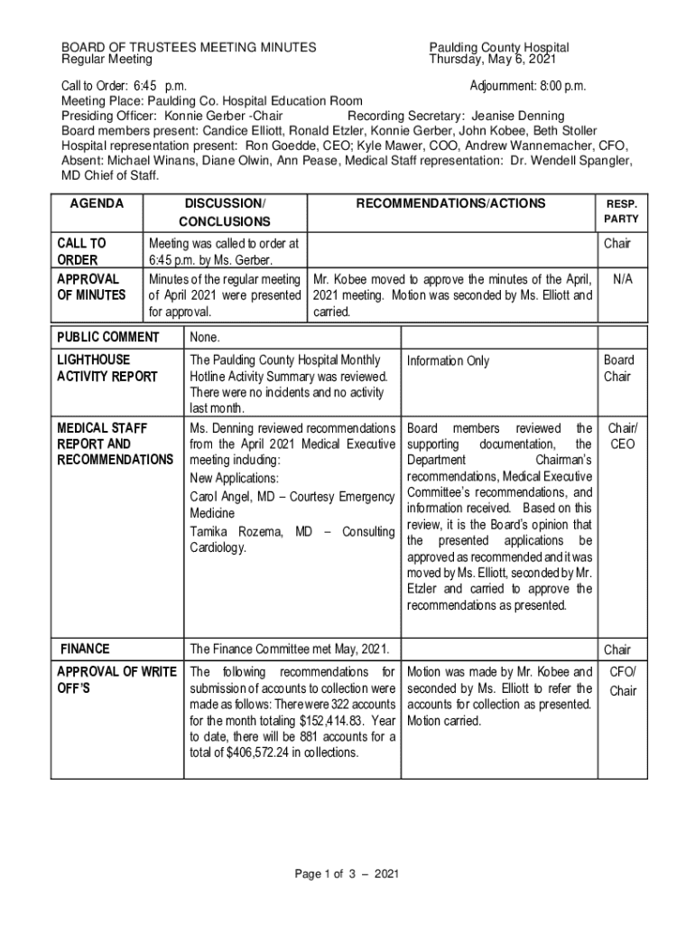 BOARD OF TRUSTEES MEETING MINUTES Regular MeetingPaulding County Hospital Thursday, May 6, 2021Call to Order: 6:45 p.m.Adjournment: 8:00 p.m.Meeting Place: Paulding Co. Hospital Education Room Presiding