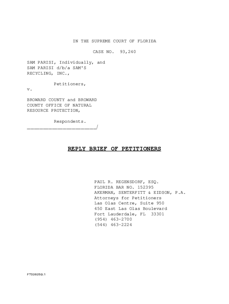 IN THE SUPREME COURT OF FLORIDA CASE NO.93,240SAM PARISI, Individually, and SAM PARISI d/b/a SAM\'S RECYCLING, INC., Petitioners, v. BROWARD COUNTY and BROWARD COUNTY OFFICE OF NATURAL RESOURCE PROTECTION,