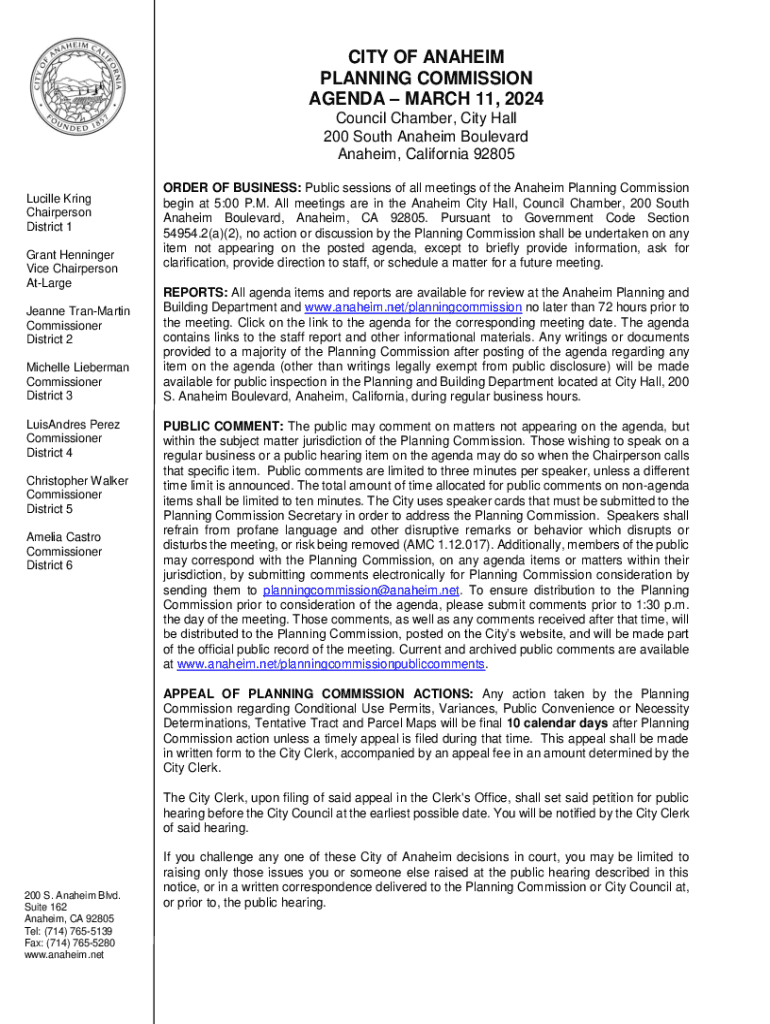 CITY OF ANAHEIM PLANNING COMMISSION AGENDA MARCH 11, 2024 Council Chamber, City Hall 200 South Anaheim Boulevard Anaheim, California 92805 Lucille Kring Chairperson District 1 Grant Henninger Vice