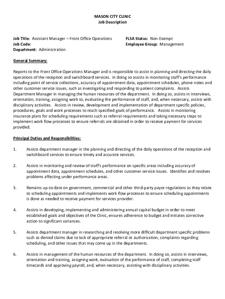 MASON CITY CLINIC Job DescriptionJob Title: Assistant Manager Front Office Operations Job Code: Department: AdministrationFLSA Status: NonExempt Employee Group: ManagementGeneral Summary: Reports