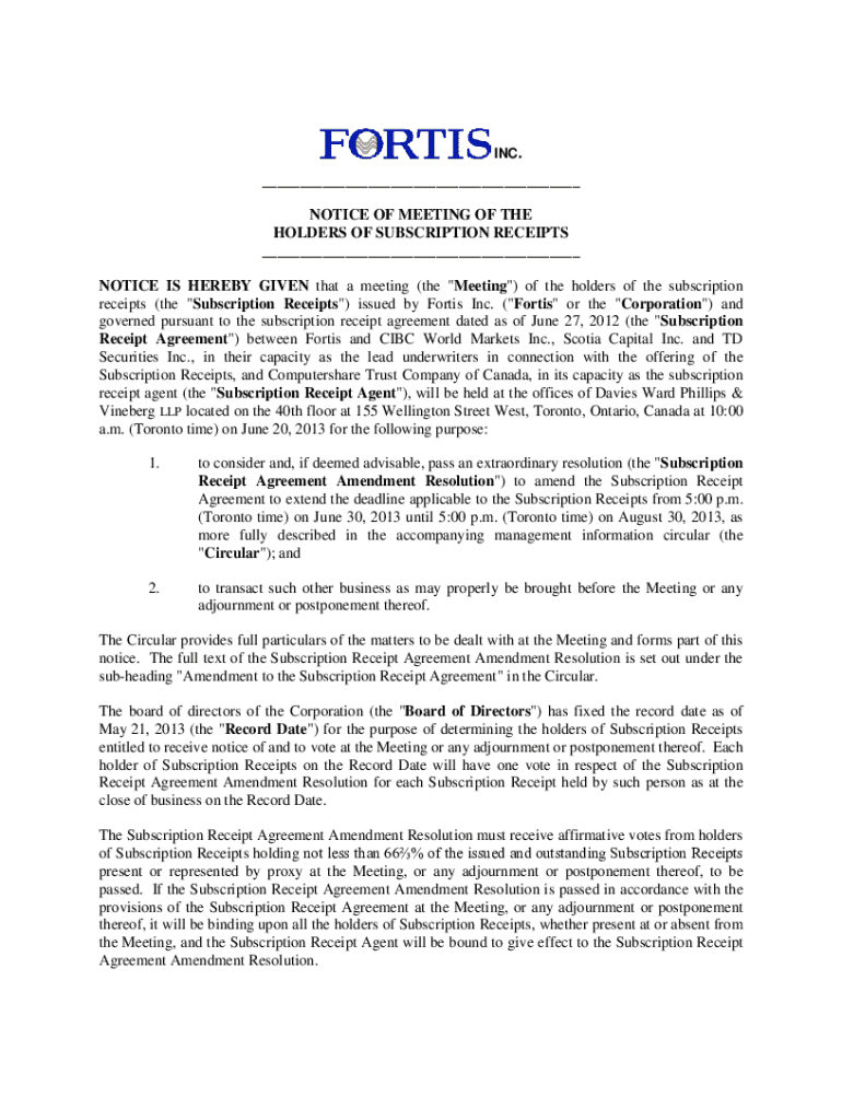 INC.___ NOTICE OF MEETING OF THE HOLDERS OF SUBSCRIPTION RECEIPTS ___ NOTICE IS HEREBY GIVEN that a meeting (the \"Meeting\") of the holders of the subscription receipts (the \"Subscription Receipts\")
