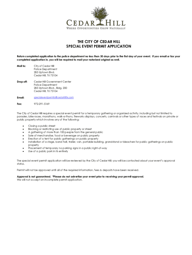 THE CITY OF CEDAR HILL SPECIAL EVENT PERMIT APPLICATION Return completed application to the police department no less than 30 days prior to the first day of your event. If you email or fax your completed