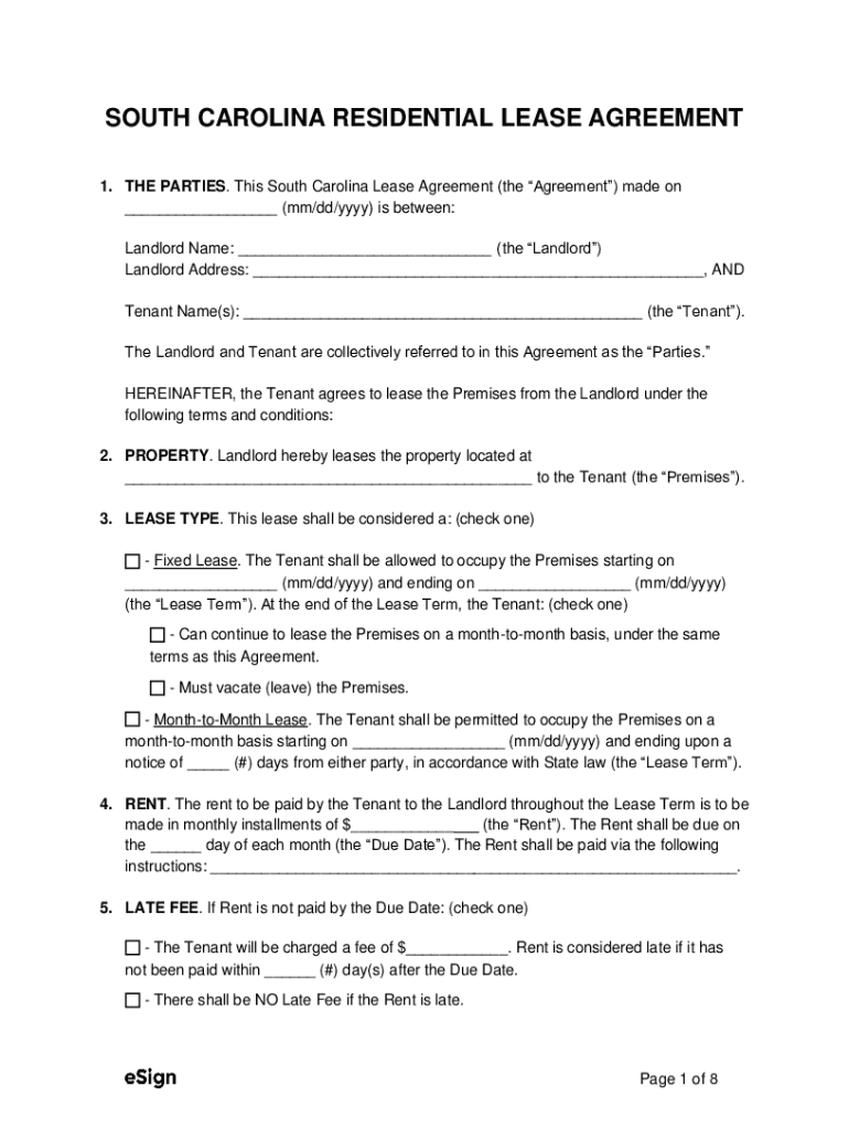 SOUTH CAROLINA RESIDENTIAL LEASE AGREEMENT 1. THE PARTIES. This South Carolina Lease Agreement (the Agreement) made on ___ (mm/dd/yyyy) is between: Landlord Name: ___ (the Landlord) Landlord Address: