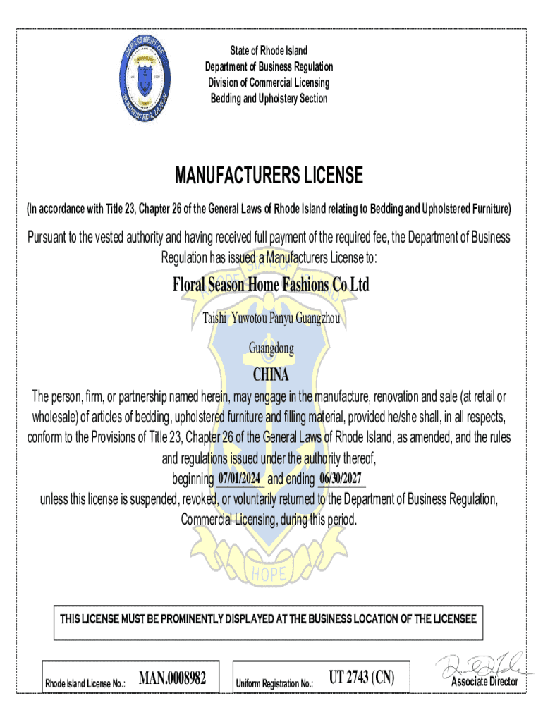 State of Rhode Island Department of Business Regulation Division of Commercial Licensing Bedding and Upholstery SectionMANUFACTURERS LICENSE (In accordance with Title 23, Chapter 26 of the General