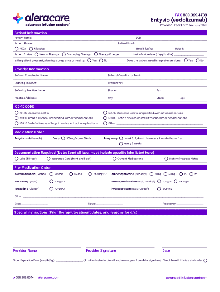 FAX 833.329.4738Entyvio (vedolizumab) Provider Order Form rev. 5/5/2023Patient Information Patient Name:DOB:Patient Phone: NKDAPatient Email: Allergies:Patient Status:Weight lbs/kg:New to TherapyContinuing
