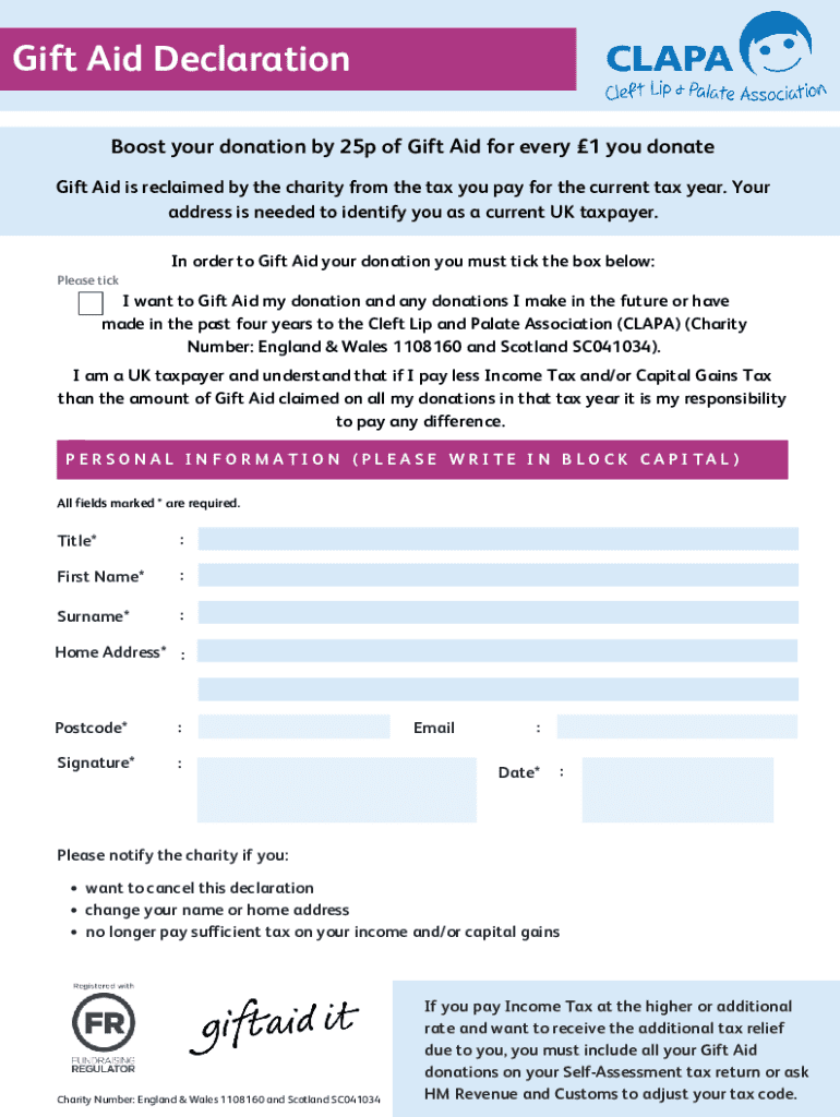 Gift Aid Declaration Boost your donation by 25p of Gift Aid for every 1 you donate Gift Aid is reclaimed by the charity from the tax you pay for the current tax year. Your address is needed to identify
