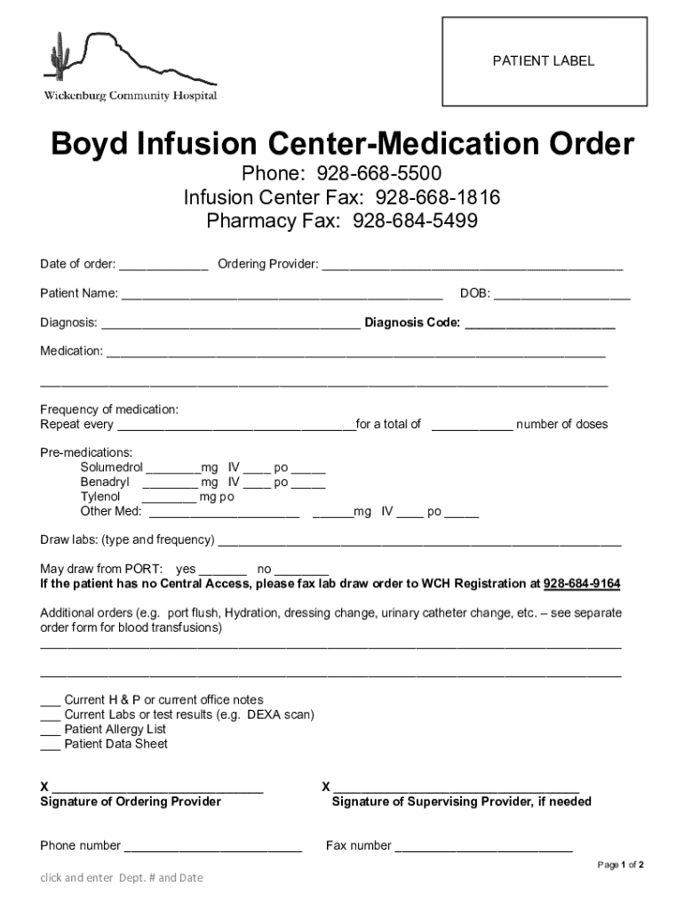 PATIENT LABELBoyd Infusion CenterMedication Order Phone: 9286685500 Infusion Center Fax: 9286681816 Pharmacy Fax: 9286845499Date of order: ___ Ordering Provider: ___ Patient Name: ___DOB: ___Diagnosis: