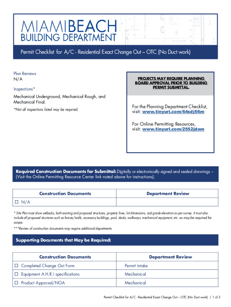 Permit Checklist for A/C Residential Exact Change Out OTC (No Duct work)Plan Reviews N/APROJECTS MAY REQUIRE PLANNING BOARD APPROVAL PRIOR TO BUILDING PERMIT SUBMITTAL.Inspections* Mechanical Underground,