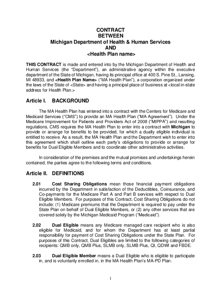 CONTRACT BETWEEN Michigan Department of Health & Human Services AND Health Plan name THIS CONTRACT is made and entered into by the Michigan Department of Health and Human Services (the Department),